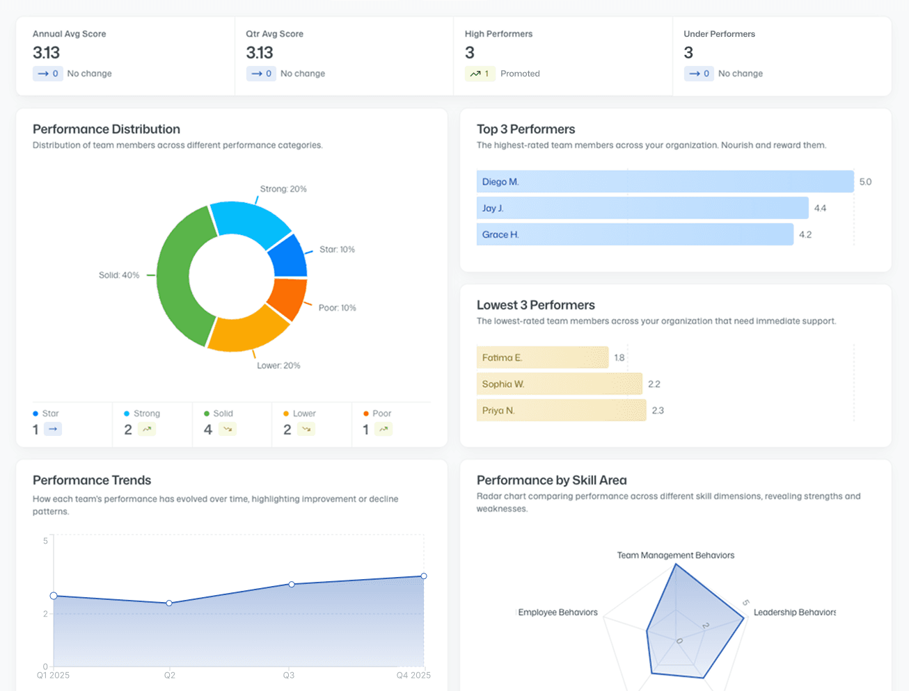 See who’s excelling, where support is needed, and how your team’s actions connect to business goals. Smart dashboards highlight trends, strengths, and gaps — so you can make decisions that drive real impact.